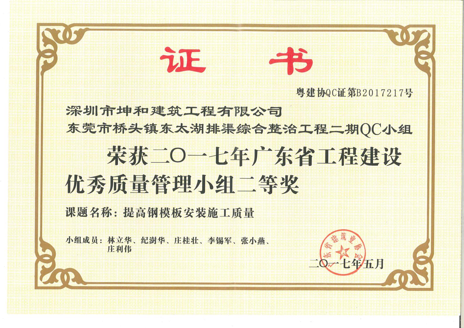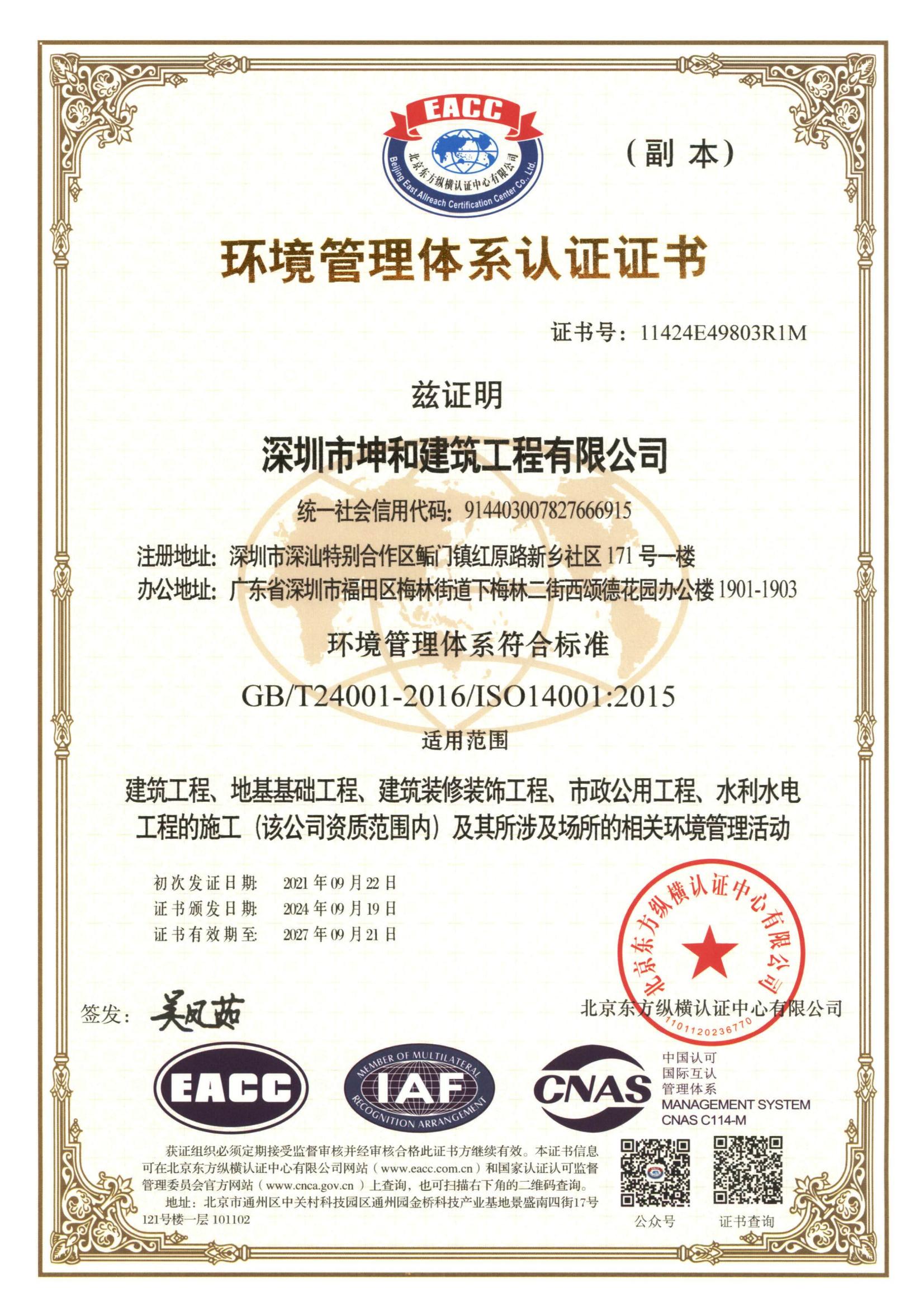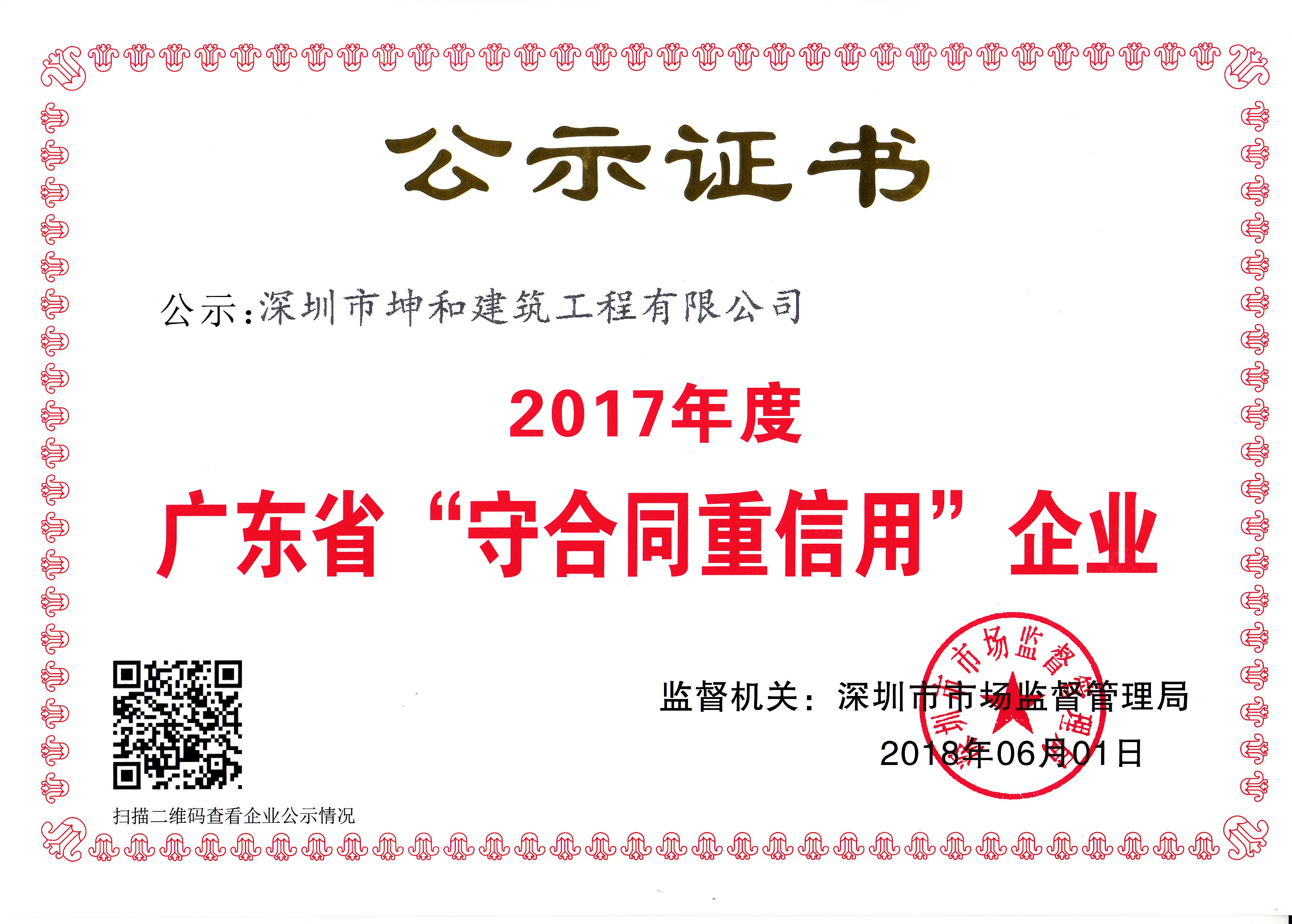 深圳市坤和建筑工程有限公司于二00五年十一月廿八日成立,經(jīng)過全體員工的共同努力,公司發(fā)展迅速,目前公司注冊(cè)資金為12010萬元,是一支具有房屋建筑工程施工總承包一級(jí);市政公用工程施工總承包一級(jí);水利水電工程施工總承包二級(jí);地基基礎(chǔ)工程專業(yè)承包二級(jí);建筑裝修裝飾工程專業(yè)承包二級(jí);建筑機(jī)電安裝工程專業(yè)承包三級(jí);鋼結(jié)構(gòu)工程專業(yè)承包三級(jí)資質(zhì)的專業(yè)施工隊(duì)伍,并于二00六年通過了ISO9001:2008標(biāo)準(zhǔn)﹑ISO14001:2004標(biāo)準(zhǔn)﹑GT/B2800-2001標(biāo)準(zhǔn)三項(xiàng)管理體系認(rèn)證。